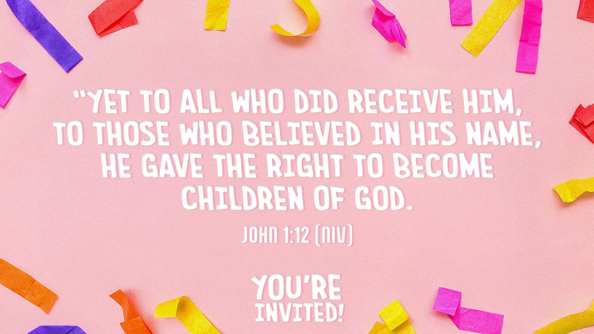 SERIES OVERVIEW: Getting invited to a party is one of the best feelings, and being left out is one of the worst. But there's good news—Jesus never leaves anyone out! He invites everyone to spend time with him, experience his love, and share it with others. This series will remind kids that Jesus' invitation is always open, and we're never too far away to join the party! In this 5-week series, kids will learn that I'm invited to believe in Jesus, love like Jesus does, experience Jesus' miracles, ask Jesus for help, and worship Jesus.
